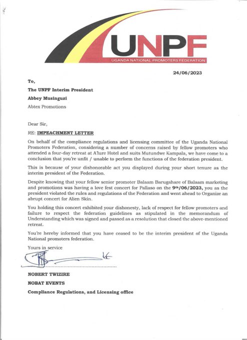 Through a long impeachment letter from the Compliance Regulations and Licensing Office dated June 24, 2023, Robert Twizire, aka Nobat Events, on behalf of others, criticized Abtex for his actions as the interim president of the UNPF.