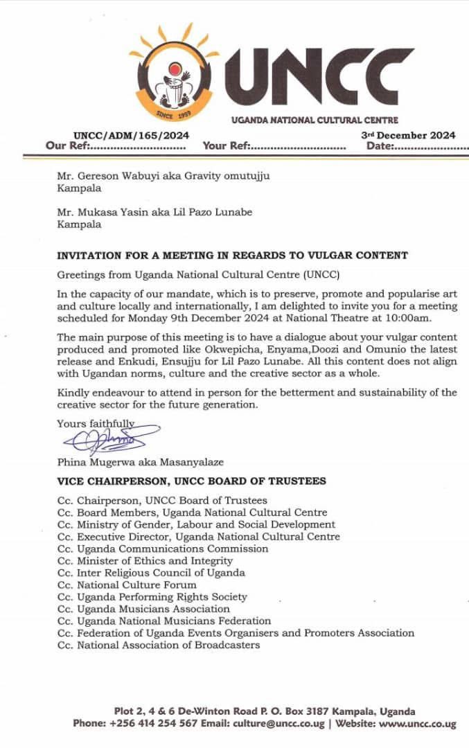Phina Mugerwa, Vice Chairperson of UNCC, signed the letter inviting the artists for discussions, emphasizing the role of the cultural body in ensuring that creative works adhere to societal norms. The meeting aims to explore ways to encourage responsible artistry while preserving the freedom of expression in Uganda’s music industry.