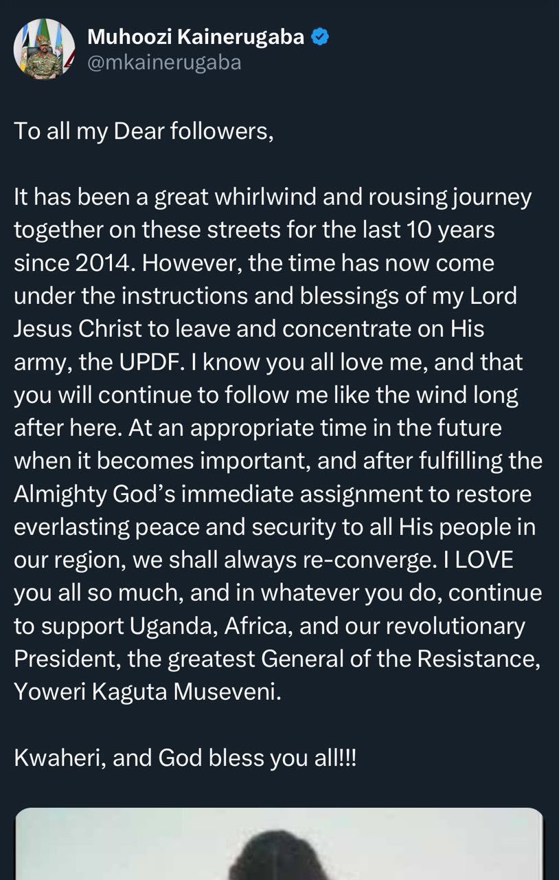 "To all my Dear followers, it has been a great whirlwind and rousing journey together on these streets for the last 10 years since 2014. However, the time has now come under the instructions and blessings of my Lord Jesus Christ to leave and concentrate on His army, the UPDF," Muhoozi wrote.