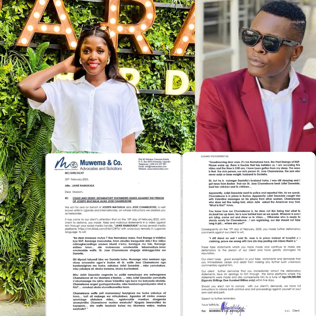 Singer Jose Chameleone and his legal team have issued a cease and desist letter to journalist and TikToker Janie Namukasa, demanding that she retract false allegations she made against him, record an apology video and also pay him UGx. 100 Million.