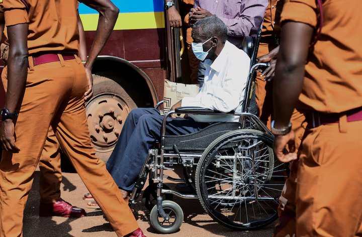 Ailing veteran politician Dr. Kizza Besigye has been produced before the Nakawa Chief Magistrates Court in a wheelchair, where he was formally charged with treason before being remanded to Luzira Prison.