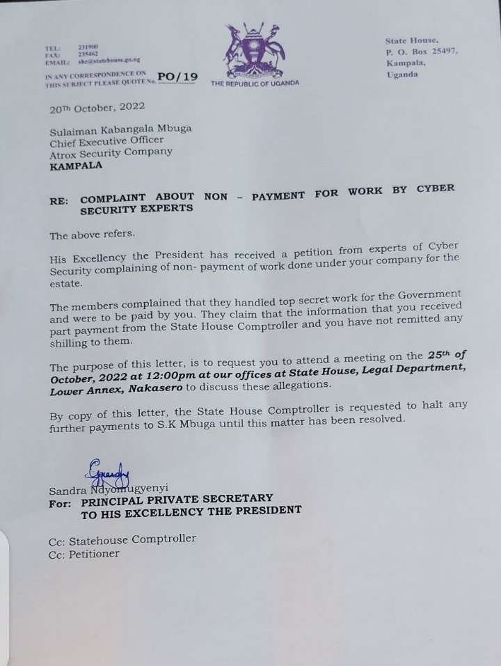 An open letter written to businessman SK Mbuga by a State House Staff, a one Sandra Ndyomugyenyi, purportedly on behalf of the Principal Private Secretary to H.E the President was shared online causing alot of chaos in reference to a complaint about Non-Payment for work done by Cyber Security Experts.