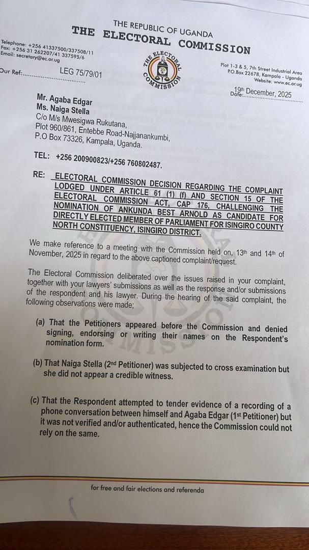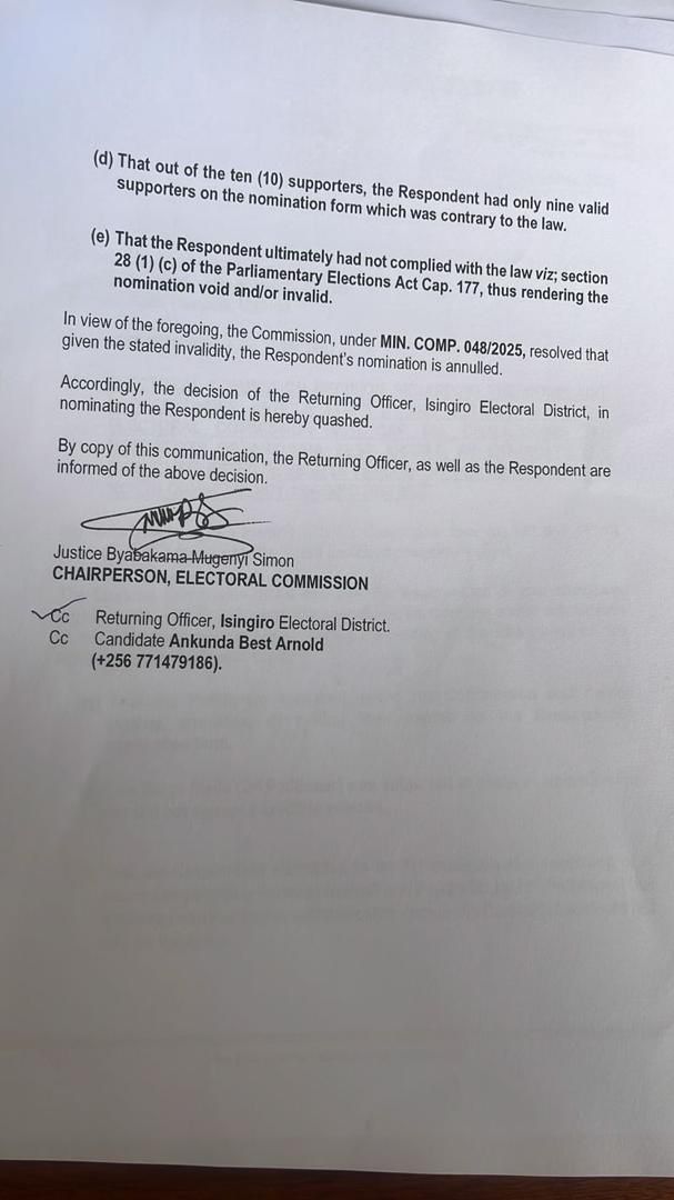 In a letter signed by EC chairperson Justice Simon Byabakama, the Commission ruled that Ankunda failed to meet the legal nomination requirements after securing only nine valid supporters instead of the required ten.