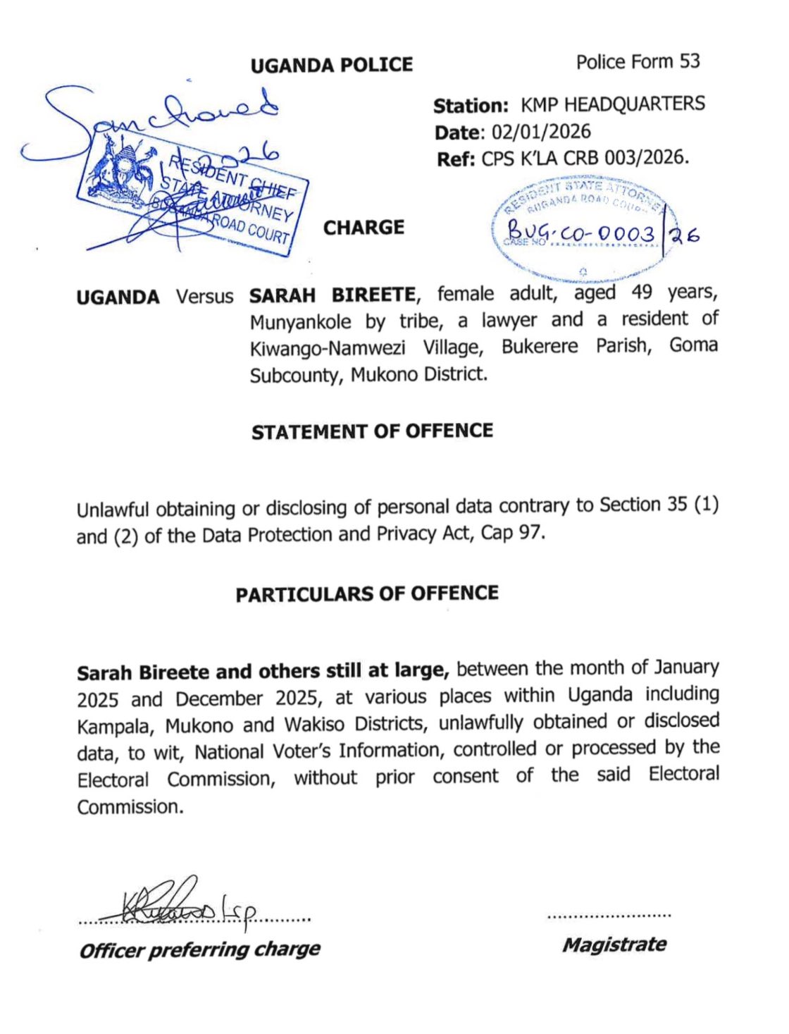 State prosecutors allege that between January and December 2025, Bireete, together with others still at large, unlawfully obtained or disclosed information from the National Voters’ Register without the consent of the Electoral Commission. The alleged acts are said to have taken place in Kampala, Mukono and Wakiso districts.