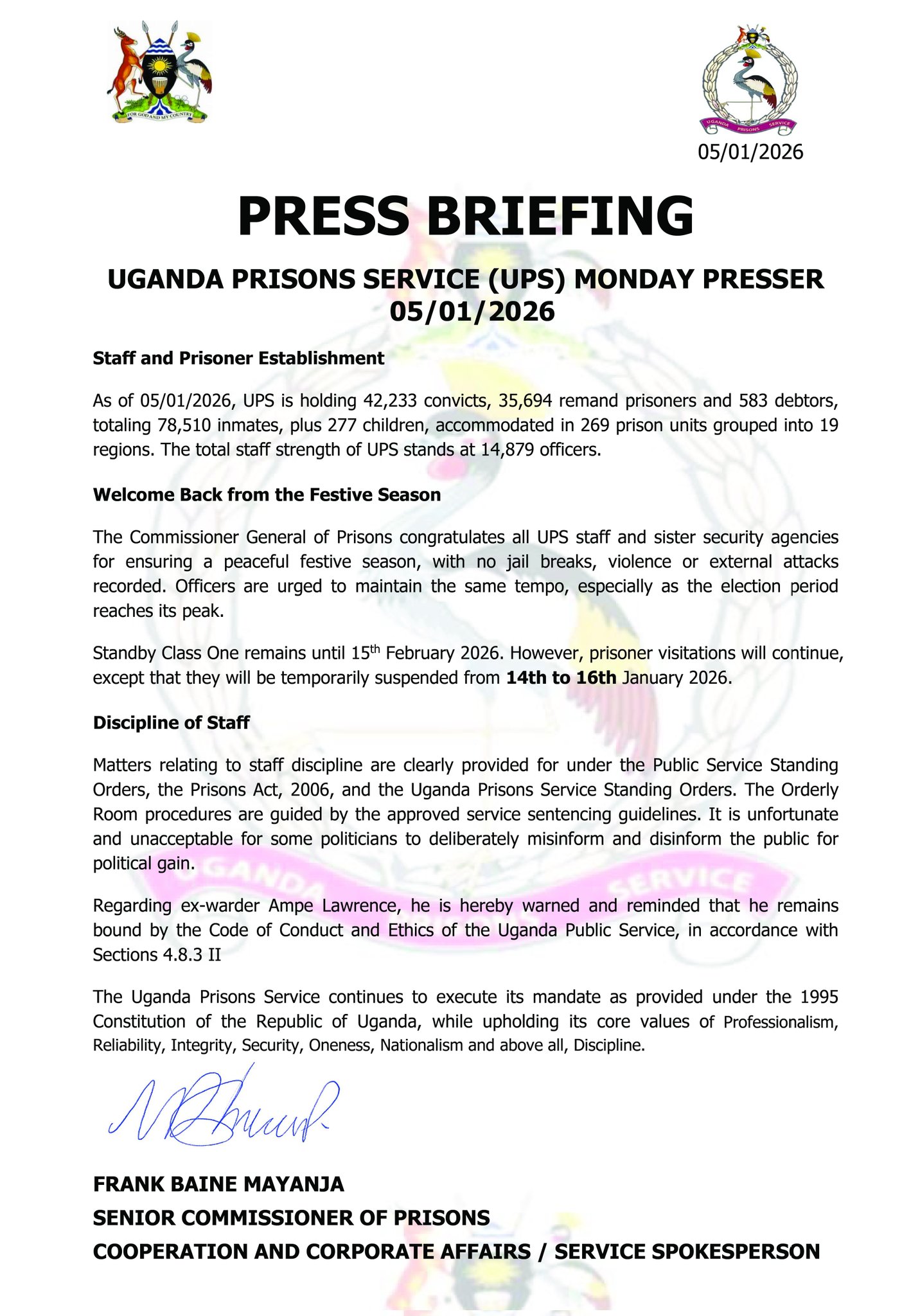Baine noted that while prison visitations will generally continue as normal, they will be temporarily halted from January 14 to 16, after which they are expected to resume. He also confirmed that Standby Class One for prisons staff will remain in force until February 15, 2026, as a precautionary security measure during the election season.
